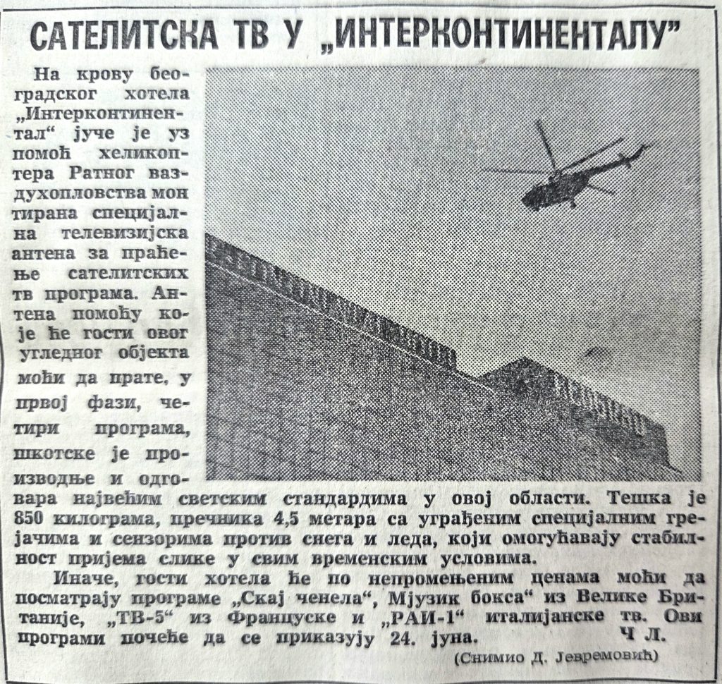 Tek kasnije pojavili su se “tanjiri”, satelitske antene, koje su bile simbol prestiža, jer ste putem njih mogli da gledate i strane kanale. Te 1986. godine privilegiju da gledaju “satelit” imali su gosti prestižnog beogradskog hotela “Interkontinental”. I to samo četiri kanala: Skaj, Mjuzik boks, TV5 i RAI1. To je bilo, zaista, “vau”.
