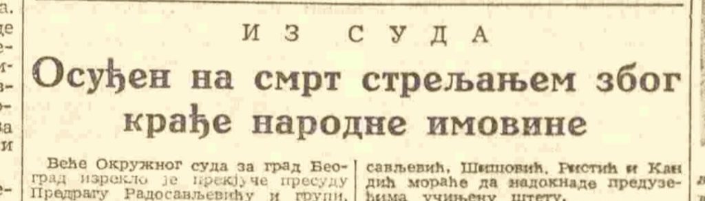 “Veće Okružnog suda za grad Beograd izreklo je prekjuče presudu, Predragu Radosavljeviću i grupi, zato što su iz preduzeća “Rad”, “Elizo”, Gradsko-saobraćajno i drugih, na lažna trebovanja podizali kritičan materijal i tako oštetili državu za preko 2 miliona dinara. Na ta trebovanja podizali su razne metalne proizvode po nižim, pa ih prodavali po višim cenama.