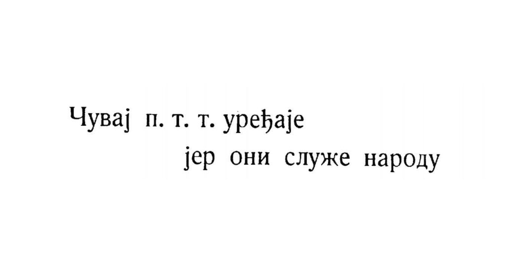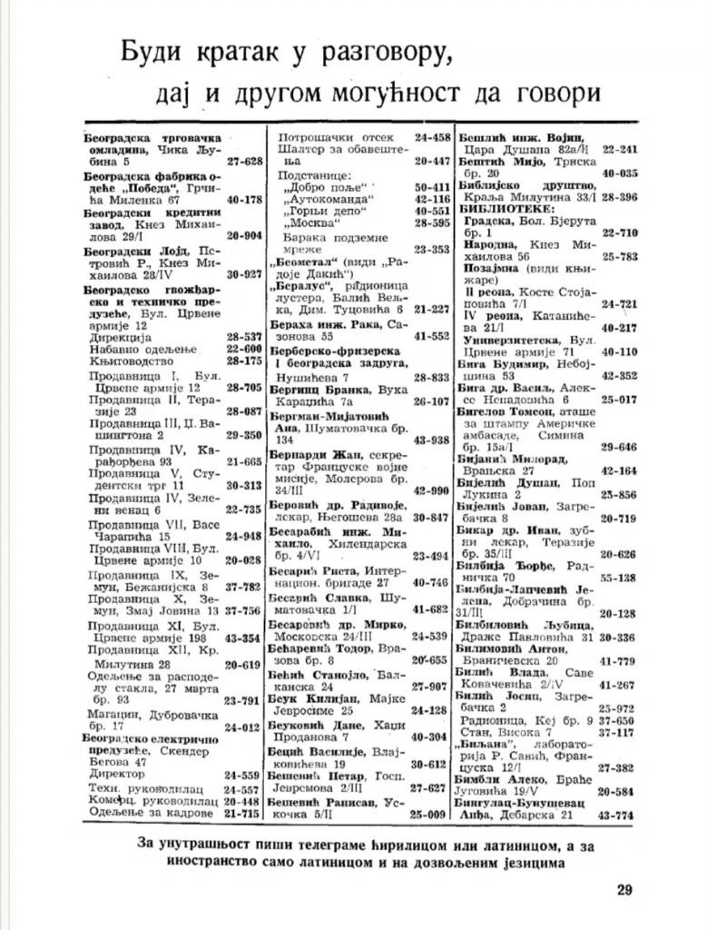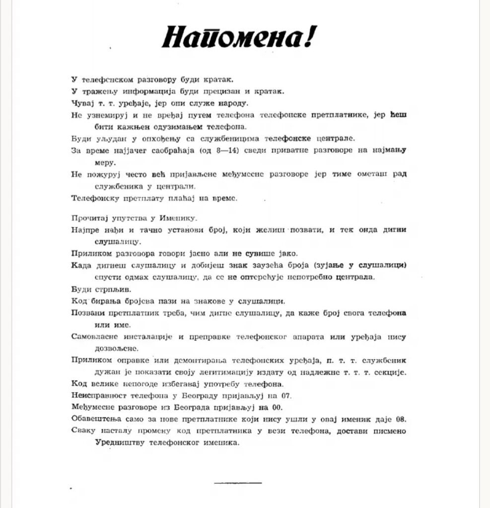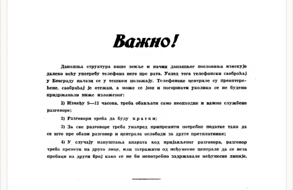 “Važno! Današnja struktura naše zemlje i način današnjeg poslovanja iziskuje daleko veću upotrebu telefona nego pre rata. Uslеd toga telefonski saobraćaj u Beogradu nalazi se u teškom položaju. Telefonske centrale su preopterećene, saobraćaj je otežan, a može se još i pogoršati ukoliko se ne budemo pridržavali niže izloženog: