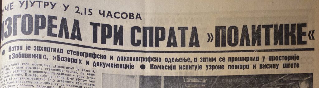 Izgorelo je stenodaktilografsko odeljenje, prostorije “Politikinog zabavnika”, “Bazara” i dokumentacije za period od 25 godina. Požar je izbio u 2.15 sati i trajao je tri sata.