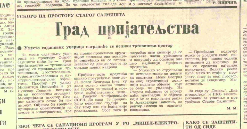 Ideja da se na Starom sajmištu, tada potpuno zapuštenom prostoru na novobeogradskoj obali Save, napravi velika robna kuća, tržni centar ili kako danas kažemo “šoping mol”, sigurno je duboko zabrinula nekog čitaoca dnevnog lista “Borbe” kome je 18. marta 1987. godine pogled skliznuo na mali tekst s čudnim naslovom – “Grad prijateljstva”.