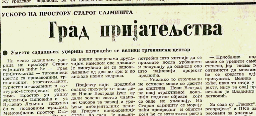 Ideja da se na Starom sajmištu, tada potpuno zapuštenom prostoru na novobeogradskoj obali Save, napravi velika robna kuća, tržni centar ili kako danas kažemo “šoping mol”, sigurno je duboko zabrinula nekog čitaoca dnevnog lista “Borbe” kome je 18. marta 1987. godine pogled skliznuo na mali tekst s čudnim naslovom – “Grad prijateljstva”.
